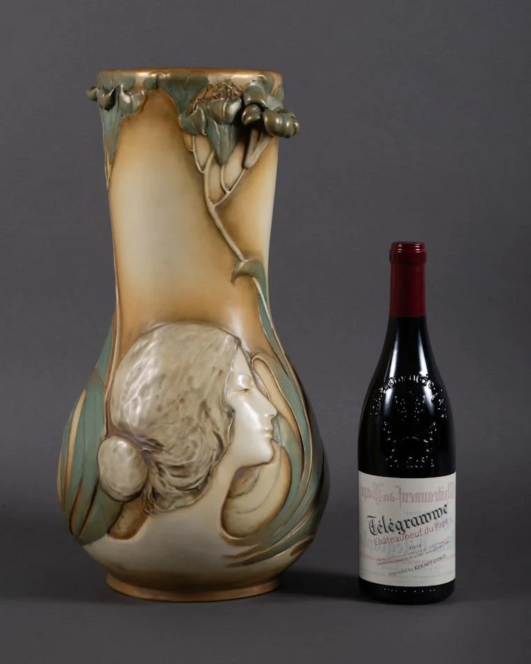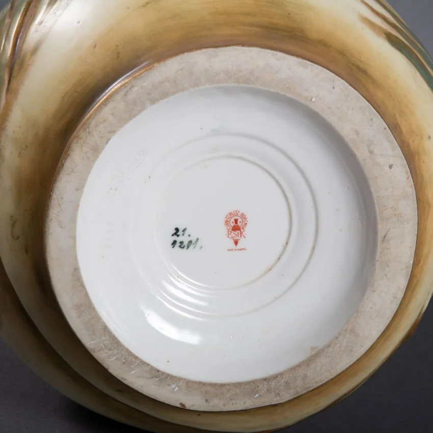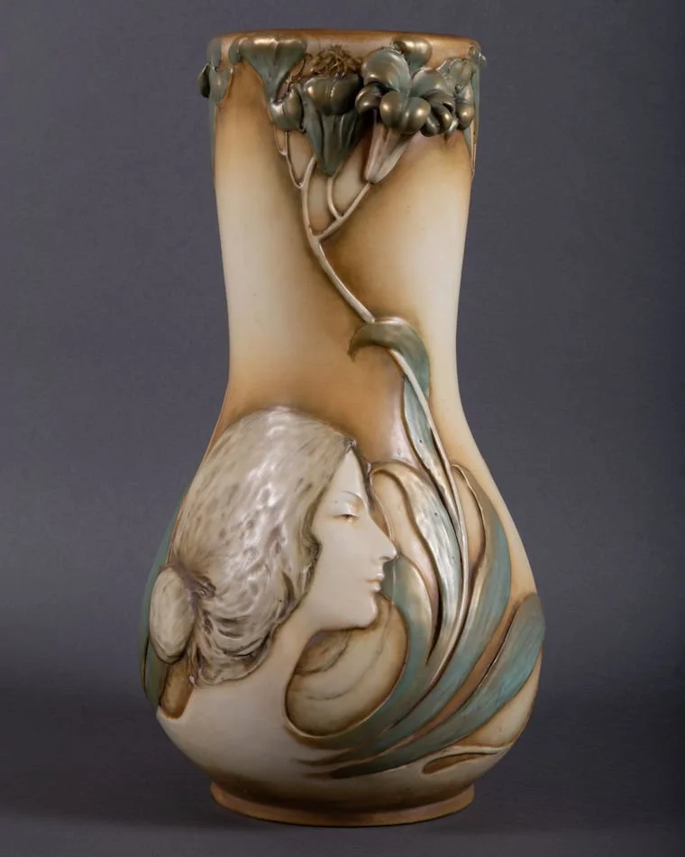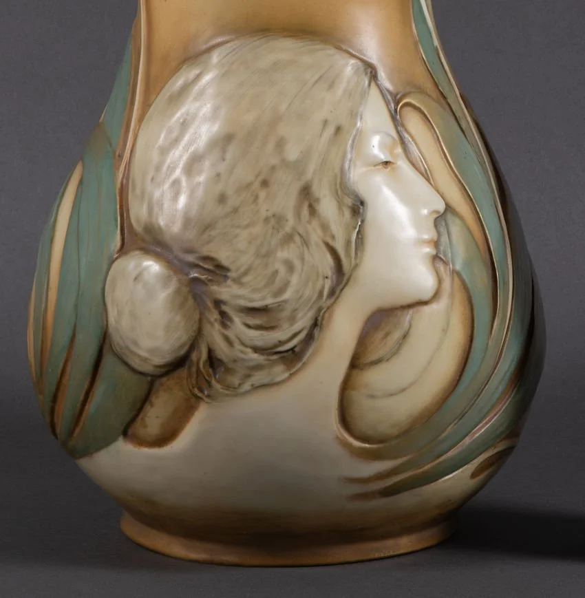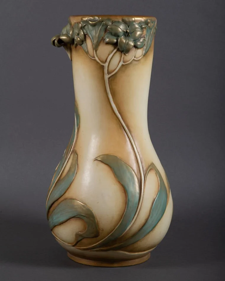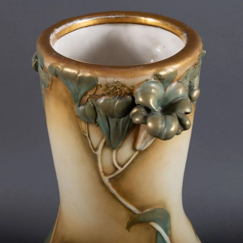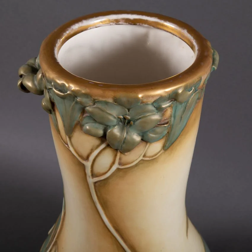 Pure Fin de Siecle Austrian Art Nouveau. Produced by RSTK / Riessner, Stellmacher & Kessel. Design attributed to Eduard Stellmacher. Red stamped mark to base: Turn Teplitz Bohemia / RSTK / Made in Austria. Condition is perfect, crisp, and clean. Measures just short of 18” tall. We are in possession of an identical vase in a darker, better, glaze coloring.