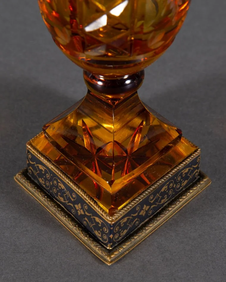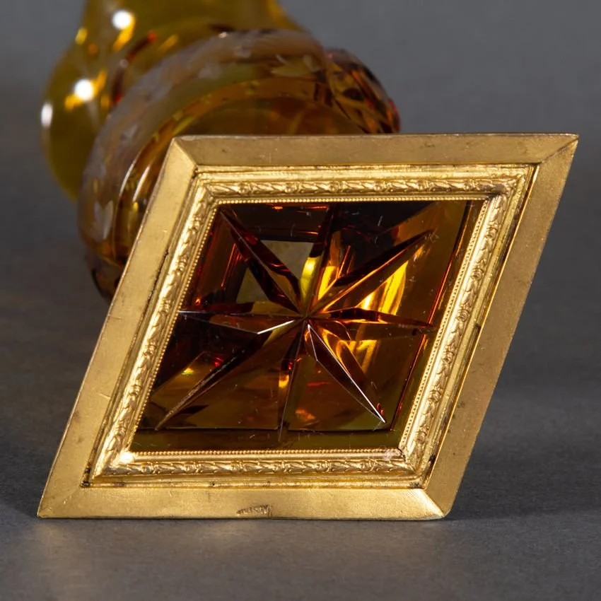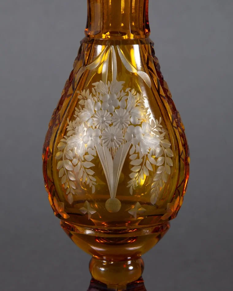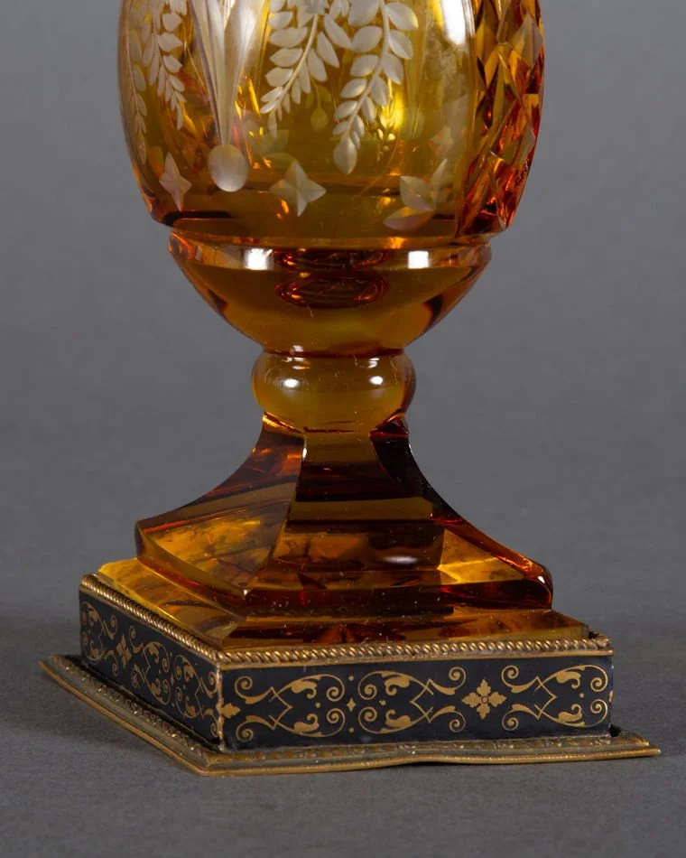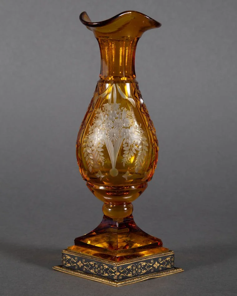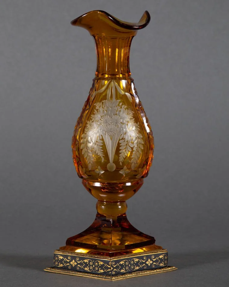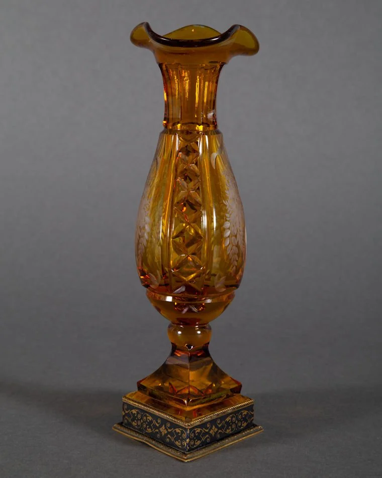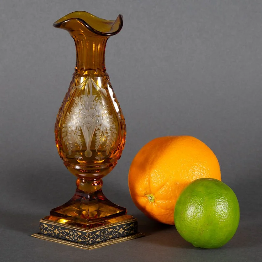 A better than average antique Bohemian glass vase with bronze mount. Amber cut to clear depicting a cut and engraved image of vase bursting with floral and foliage decoration. Same motif to both sides. No makers marks present, though the base is marked within foot of bronze mount ~ Austria. Presumably dates prior to WW I. Very difficult to attribute this to any particular glass hut. Haida? Novy Bor region? You decide. It measures 7 1/2” tall. The condition is excellent and undamaged; There are no chips, no cracks, and no repairs.