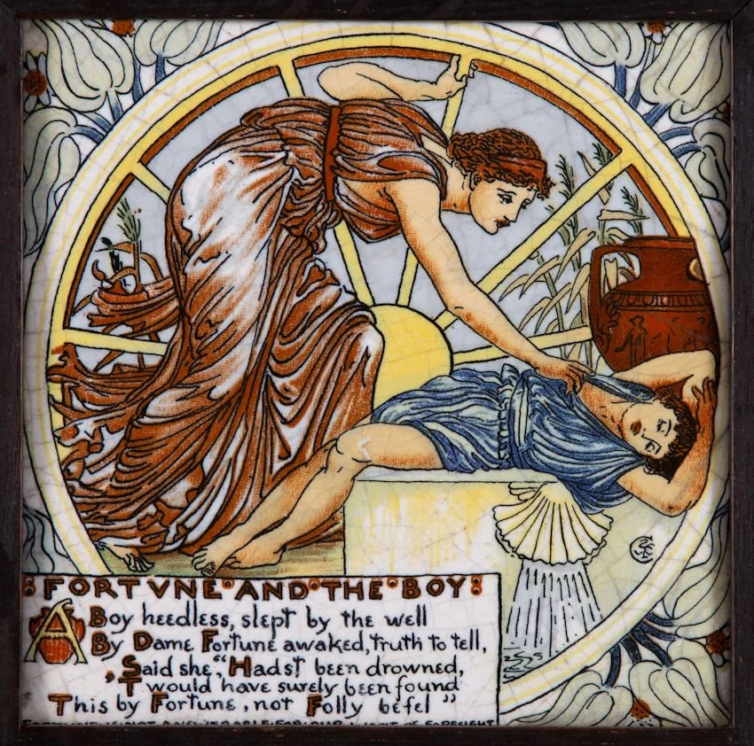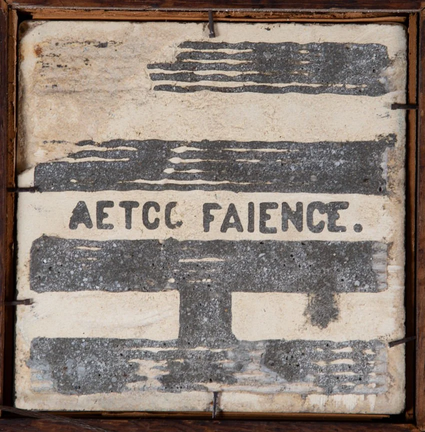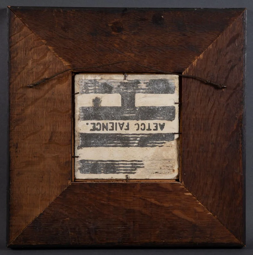 Walter Crane for American Encaustic Tile Company. The transfer image depicts an illustration titled “Fortune and the Boy” from his work Baby’s Own Aesop. The tile measures approximately 6” square while the outer dimension of its wide dark finished fumed oak frame measures 13 3/4” square. Incised mark to back of tile: AETCO FAIENCE. Overall condition is very good to excellent though there are some issues of note. There is mortar residuals on back of tile and associated grinding marks with some chipping. Front of tile appears undamaged ,some crazing but no chips and no cracks. Note Walter Crane monogram tucked in image at lower right.