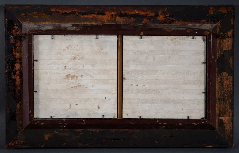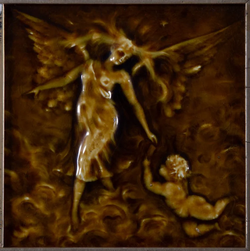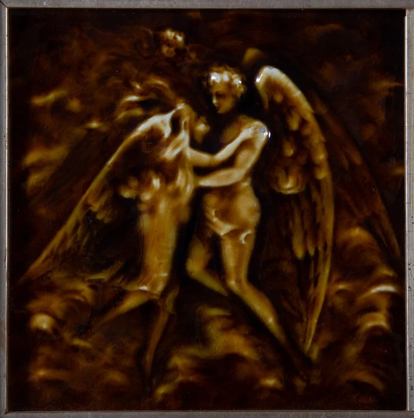 Circa 1890 Diptych of Two Allegorical Tiles Framed in dark fumed quarter sawn oak frame with gilt liner. English or American? I think American though there are no makers marks present. The grid pattern to the back implies an English origin as it is the same grid / grill pattern used by W & E Corn / Henry Richardson Tile Co. The condition is excellent though both tiles have the usual sporadic crazing which is typical of most Victorian tiles. Very small chip at left tile at shoulder of male angelic figure and a few sporadic small and inconsequential bruises to the amber slip glaze. Each tile measures 6” square while the overall outer frame size is 16 5/8” by 10 1/8”. I wish that I could identify the specific sculptor, but he or she was very good!