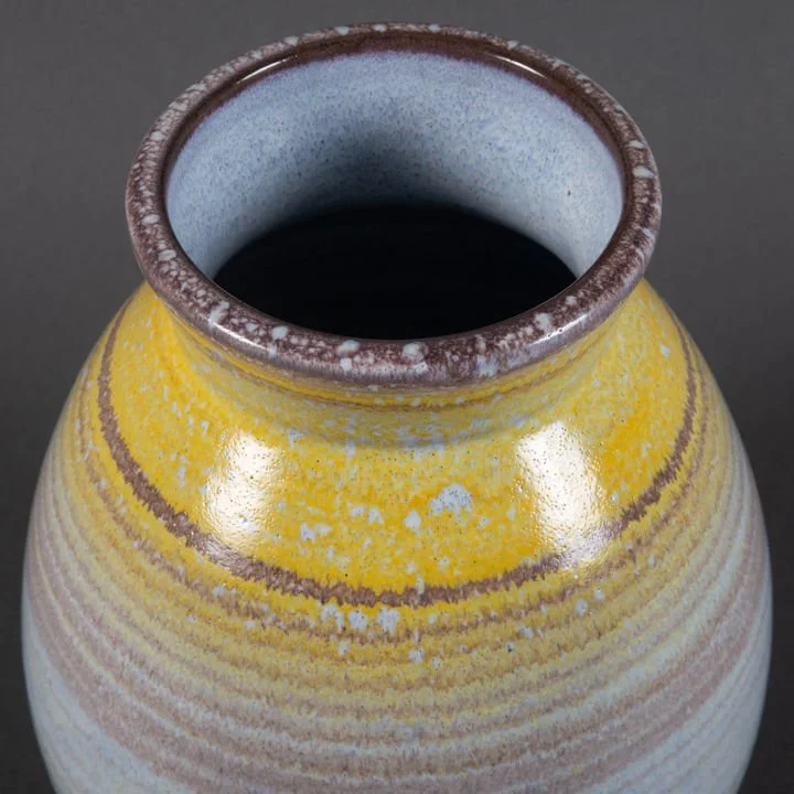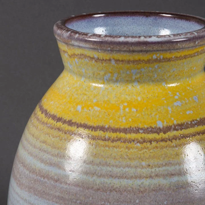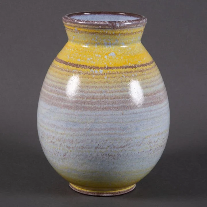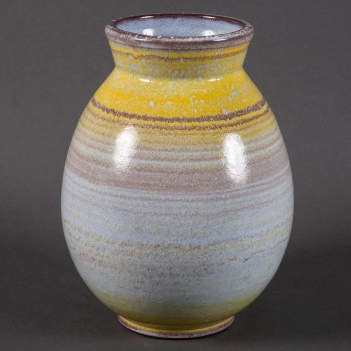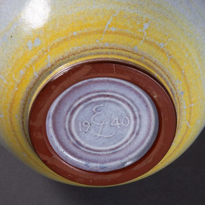A conversational description! Edgar Littlefield created this pot presumably while developing his vitreous high fired pottery while at the newly established art division in ceramics at Ohio State University. Imagine the creative environment that must have existed while Edgar Littlefield worked alongside Arthur Baggs and others while developing the vitrified red clay body that this vase is comprised of. Ceramics Engineering, Chemistry & Art meet to produce technically and aesthetically advanced pottery such as this pot. The vase is simply signed E L in fanciful script along with the date of 1940. Perfect condition and measuring 9 1/4” tall. While similar one-off works reside in many museums, the market is such that values seem disproportionately low considering the rarity, aesthetics, and technical achievements of such a vases. I adhere to the market realities, but with a sense of confusion as these vases by Baggs & Littlefield are not common. Are they too rare and therefore less understood? Is this a case of, “well, there is not one in so & so’s collection”? Yet, prized and displayed in museums. I cease my ramblings and invite comments, conversation, and interest in this exceptional pot.