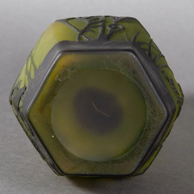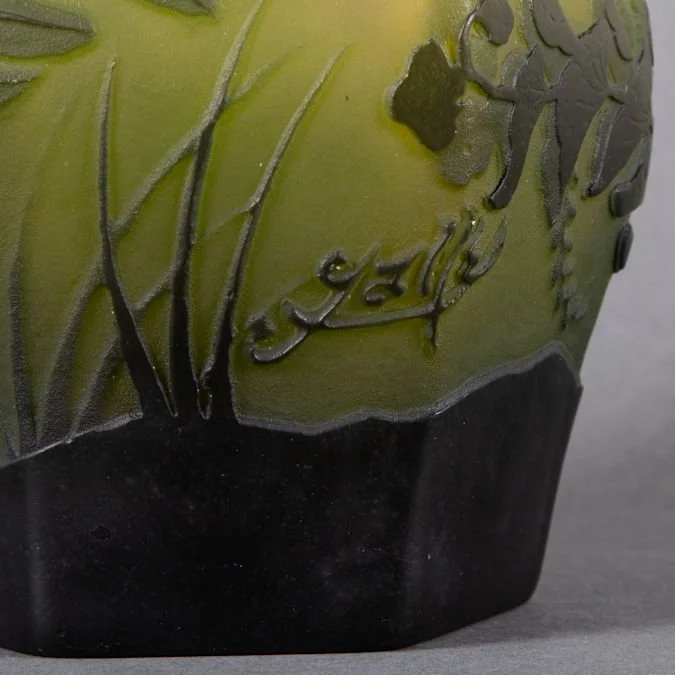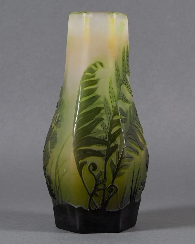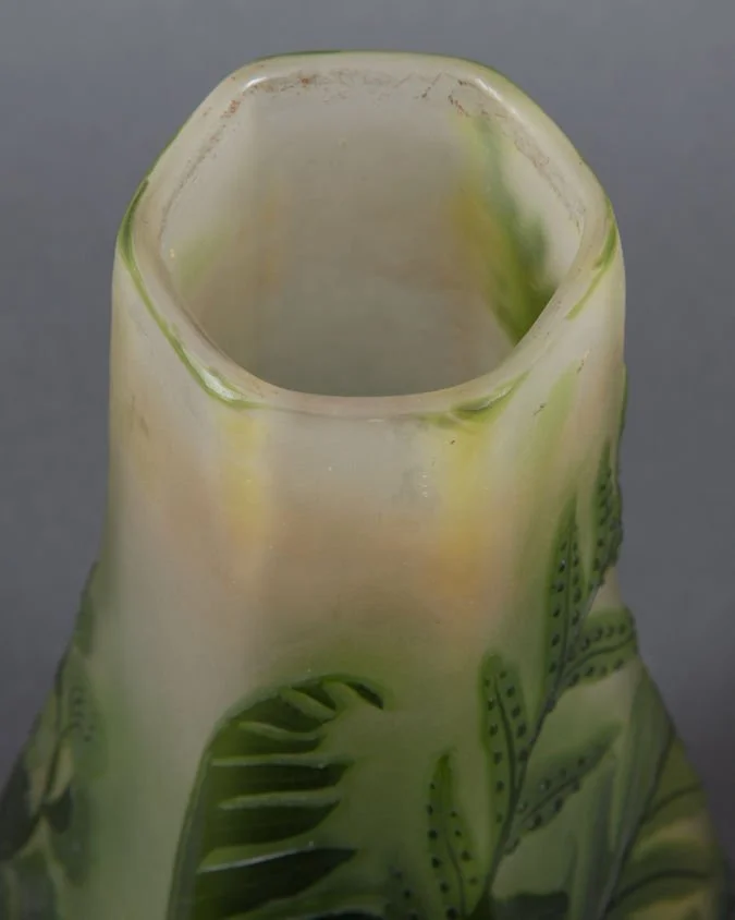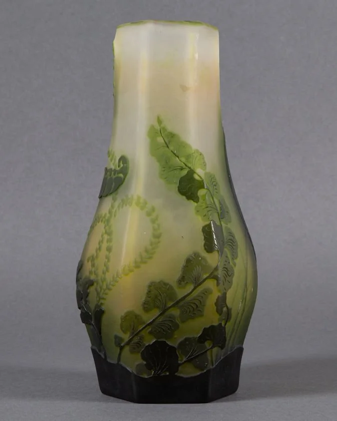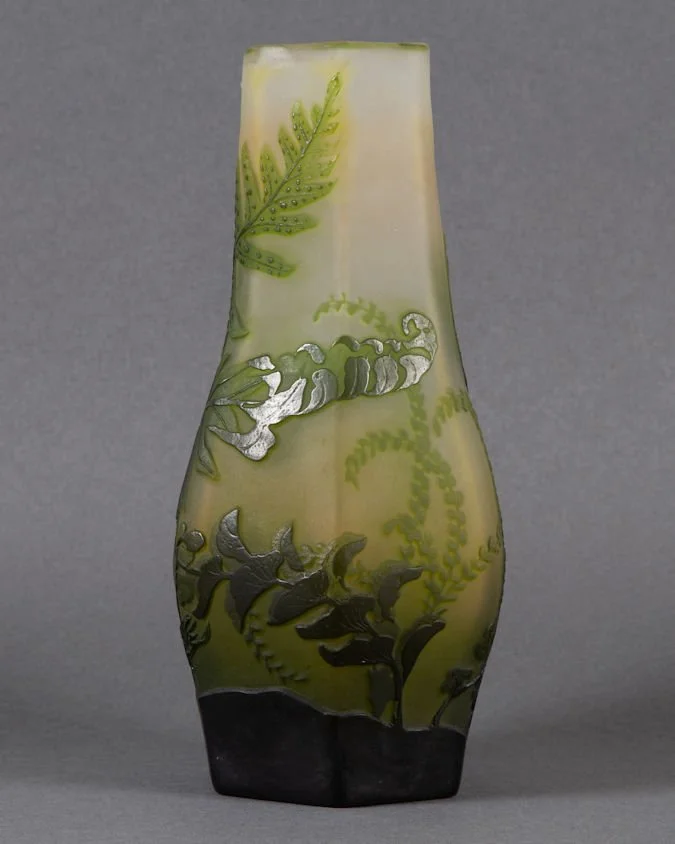 An Emile Galle Cameo Glass Vase depicting a Fern and Foliage Motif. Measures 8 3/4 inches tall. Condition is excellent. Nicely decorated with deep acid cut back depth & great attention to details of foliage. Though single color it is an impressive example nonetheless.