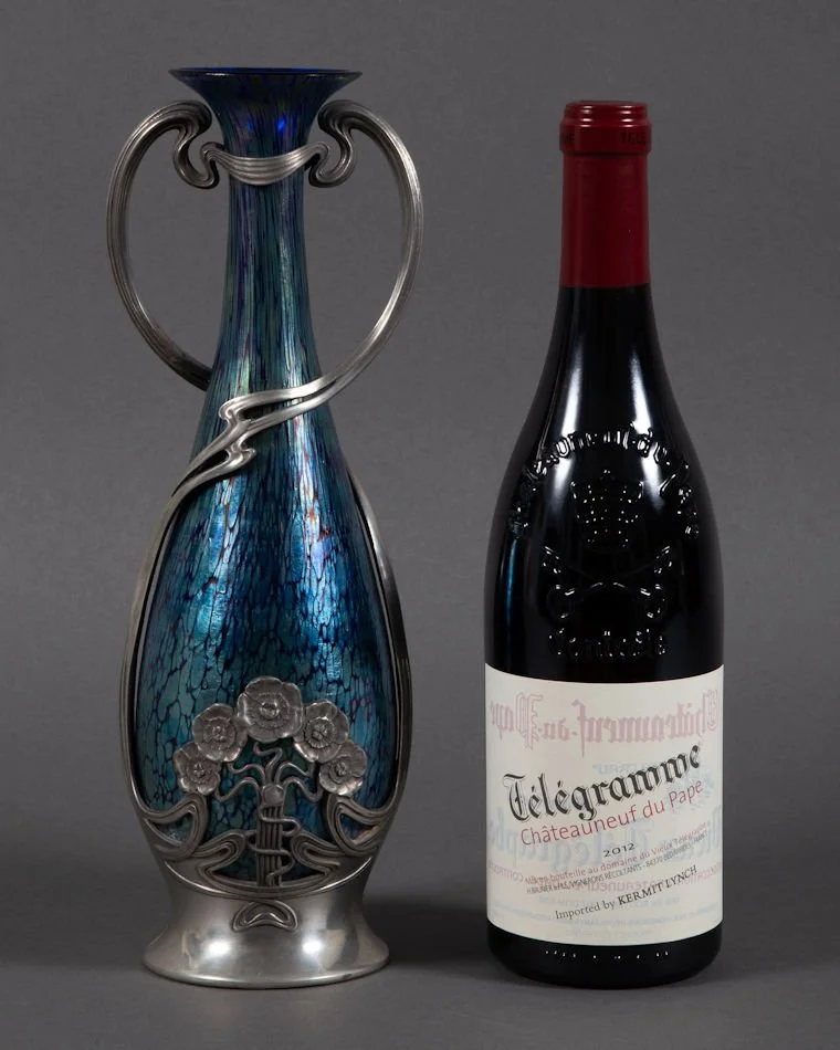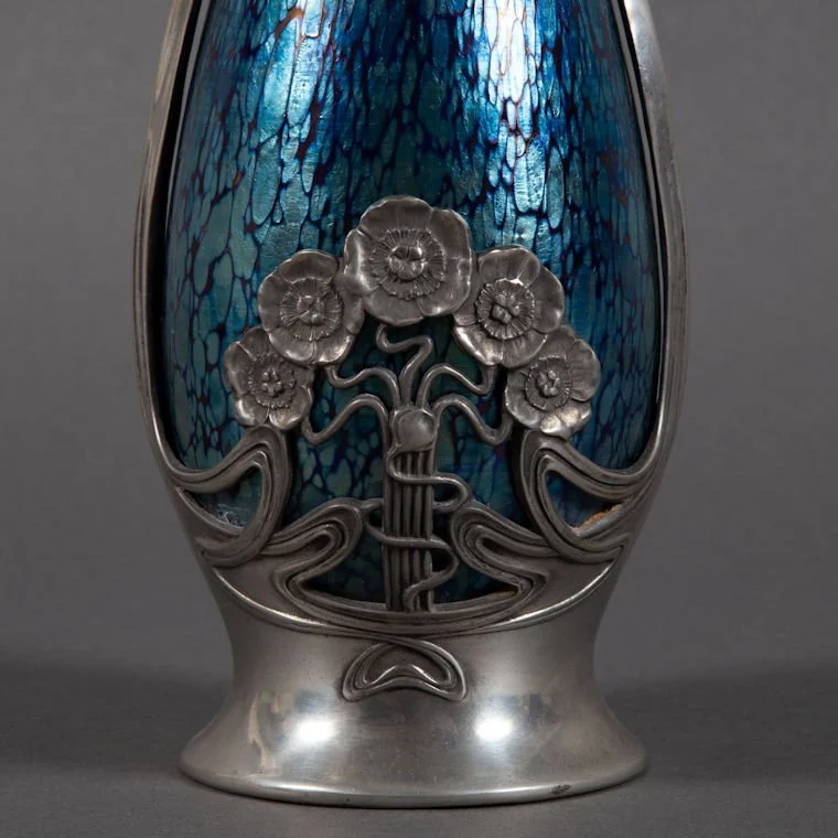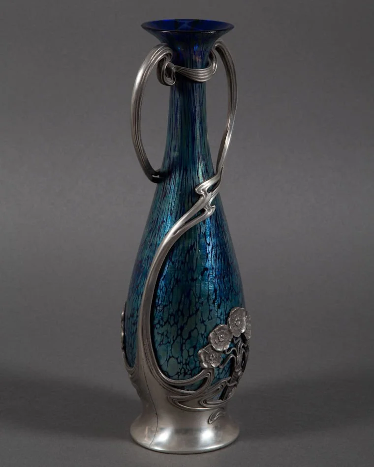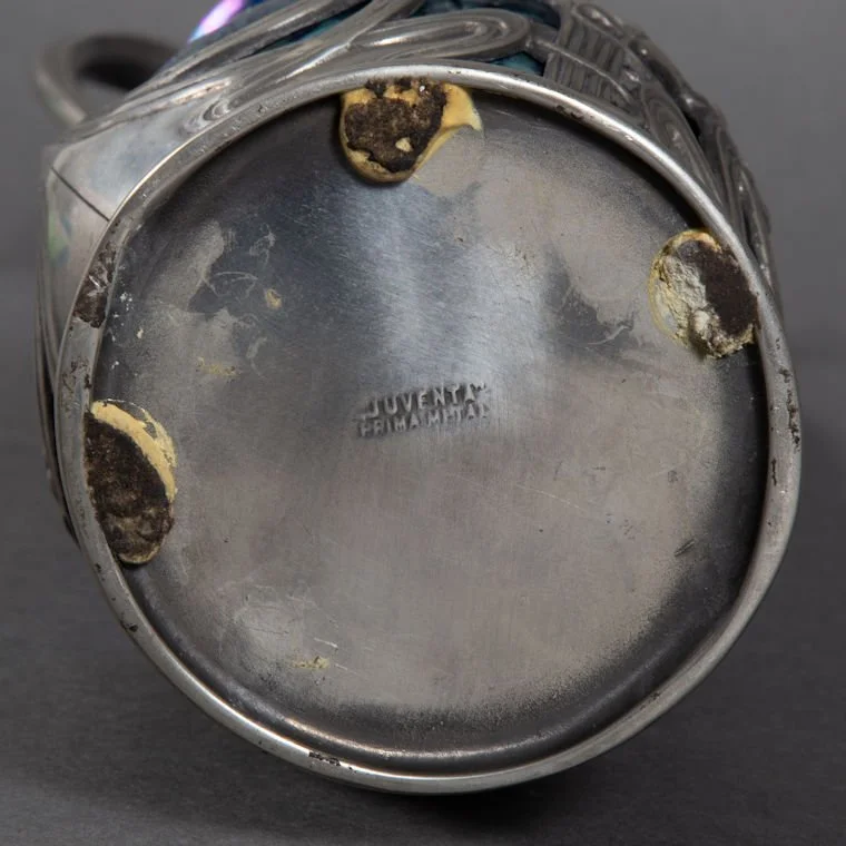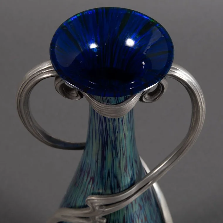 Loetz Cobalt Papillon Art Glass Vase with Juventa Art Nouveau Pewter Mount. Vase: Loetz, Klostermuhle ~ Mount: Urania Metallwarenmetalfabrik, Maastricht. Height of vessel is 12 1/2”. Base is marked JUVENTA PRIMA METAL. Brightness to patina ratio is just right on the pewter mount and the glass is in perfect condition.
