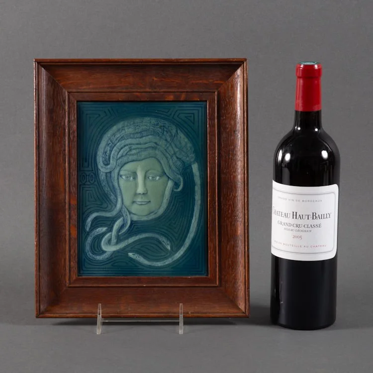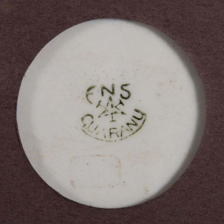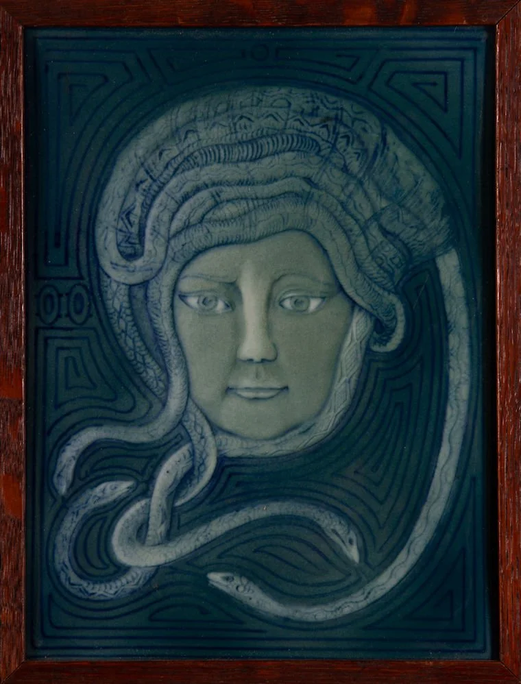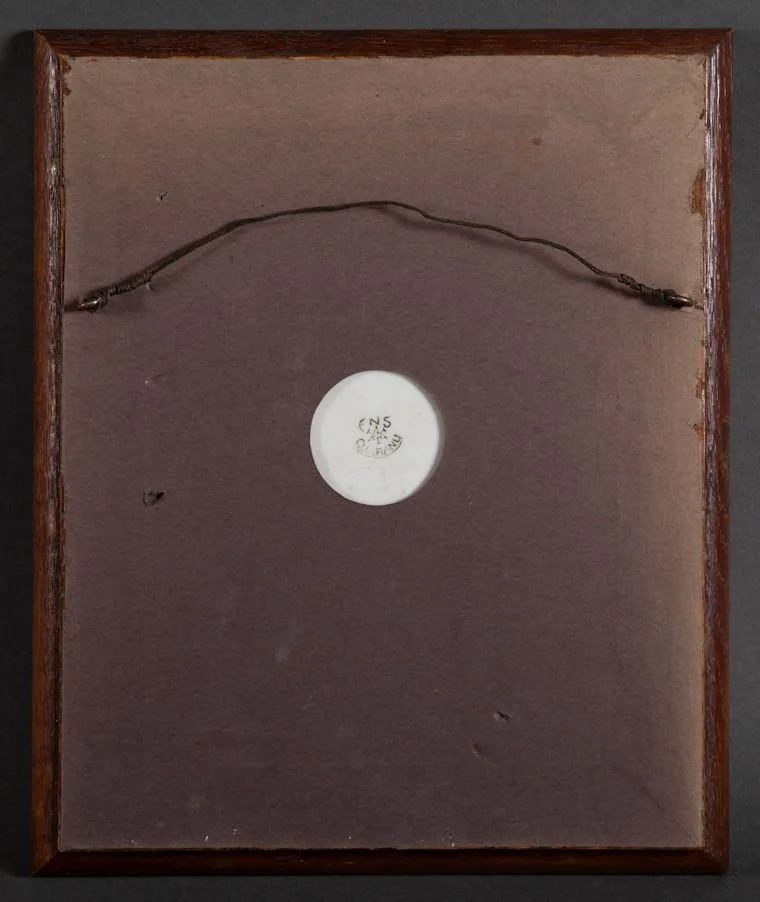 Karl Ens German Porcelain Plaque depicting Medusa; Thuringia, Germany. We attribute this design to Berthold Boess as it is strikingly comparable to the facial features scene in all of his porcelain figurines, perhaps the same sitter. The oak frame measures just short of 10” by 12” while the tile measures approximately 6” by 8”. We were fortunate to have discovered marks to back of tile and carefully exposed them to view and photograph. The condition is excellent and undamaged to both the tile and the frame.