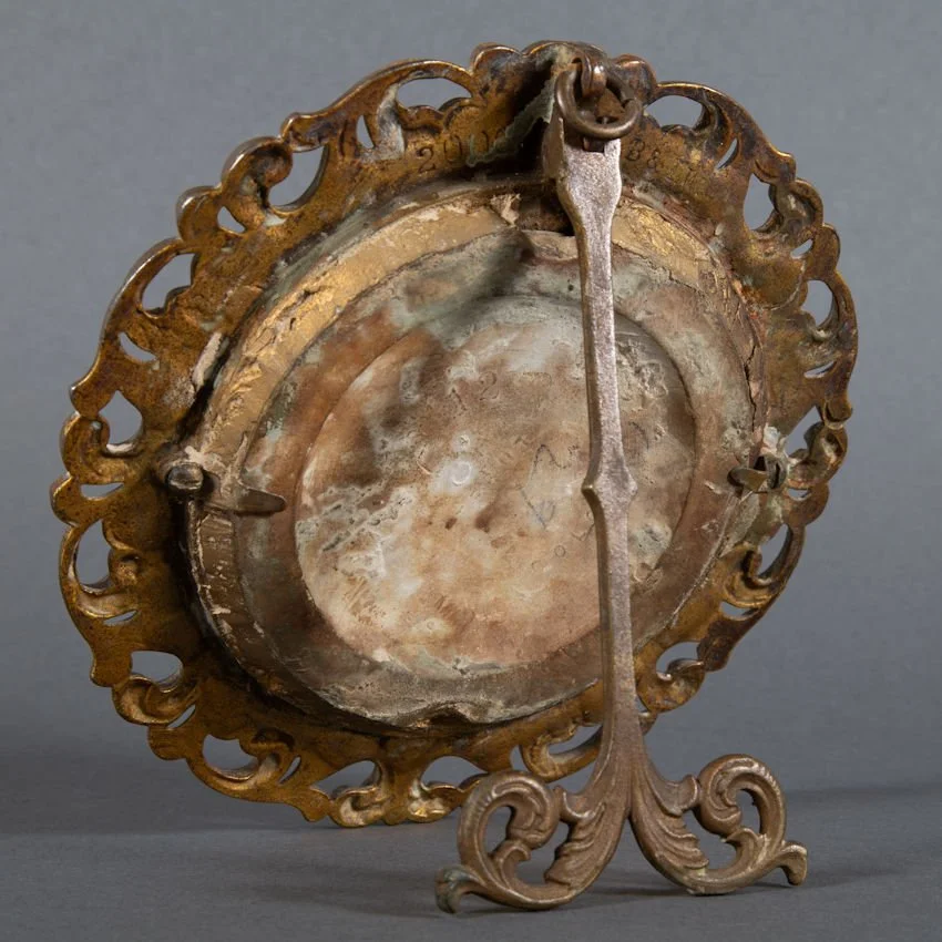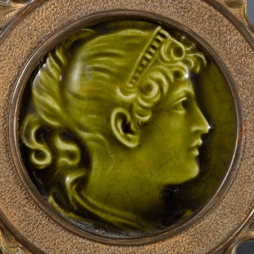 Seldom seen package with combination of tile framed as an art object and as produced in the late 19th century ~ Circa 1890. Tile is unmarked, though I believe it to be by J & J G Low of Chelsea, Mass. (I forever consider myself a student of decorative arts; therefore, I invite corrects and intellectual conversations). Regardless of maker, certainly American. Note foundry name is present with debossed initials present in the casting: N.B.&I.W. ~ for National Brass & Iron Works of Reading, Pa. (you often find their easel back mirrors and portrait frames). Forgive the ramblings of this enthused dealer. Overall dimensions: Overall diameter ~ 6 3/4” and Tile diameter is just over 4”. Condition is great accepting of the usual overall crazing to its slip glaze; otherwise, untouched original surface and as manufactured.