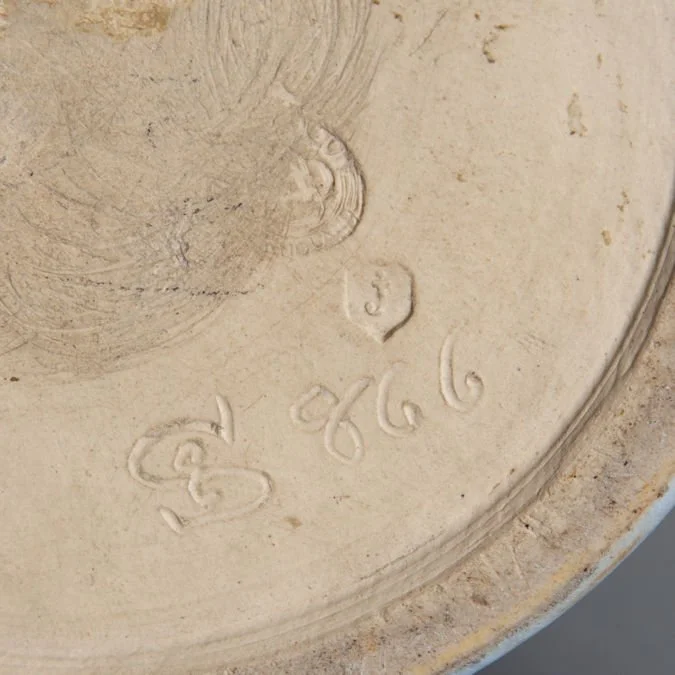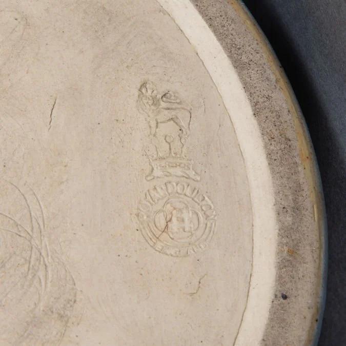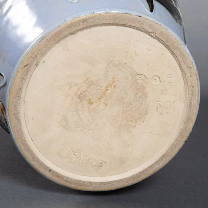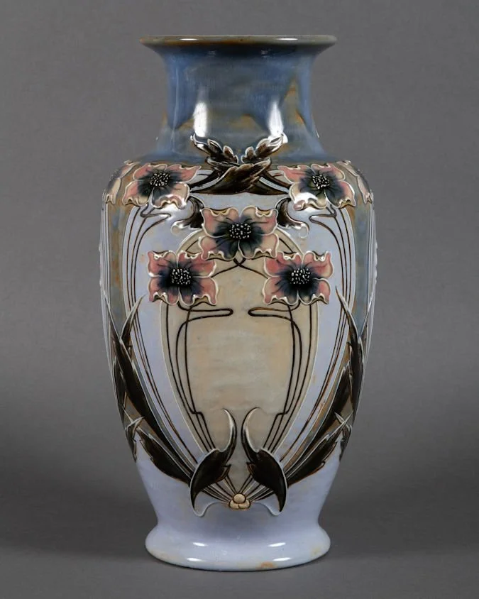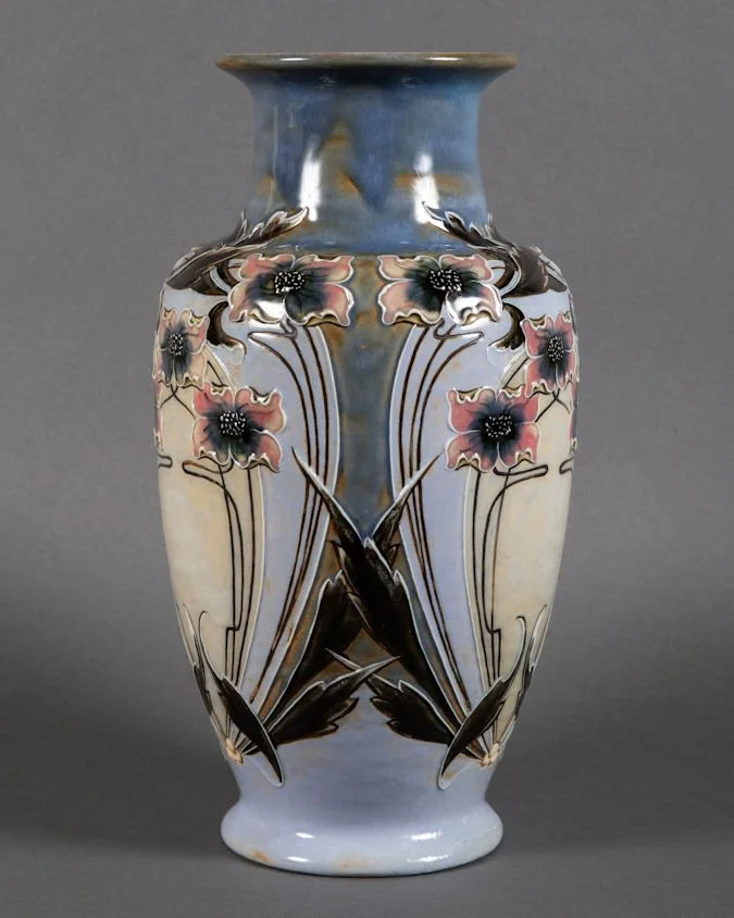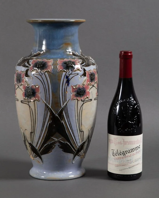 British Art Nouveau Doulton Lambeth Large Art Pottery Vase decorated by Eliza Simmance. She was highly regarded by her contemporaries yet often overshadowed by the Barlow sisters ~ clearly an imaginative decorator as this vase demonstrates. Such pure Art Nouveau examples rarely surface. This example is tall measuring 14 3/4” high. The condition is excellent and undamaged. Further, the execution is superior having crisp line details and control of color that do not bleed from their intended locations. Very fine example.