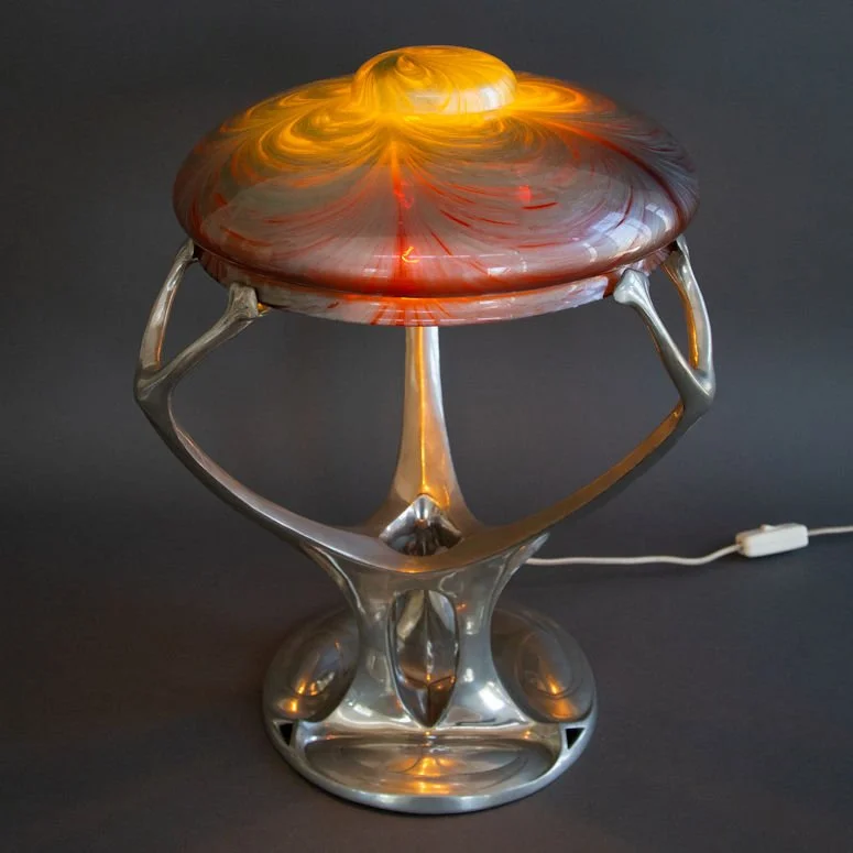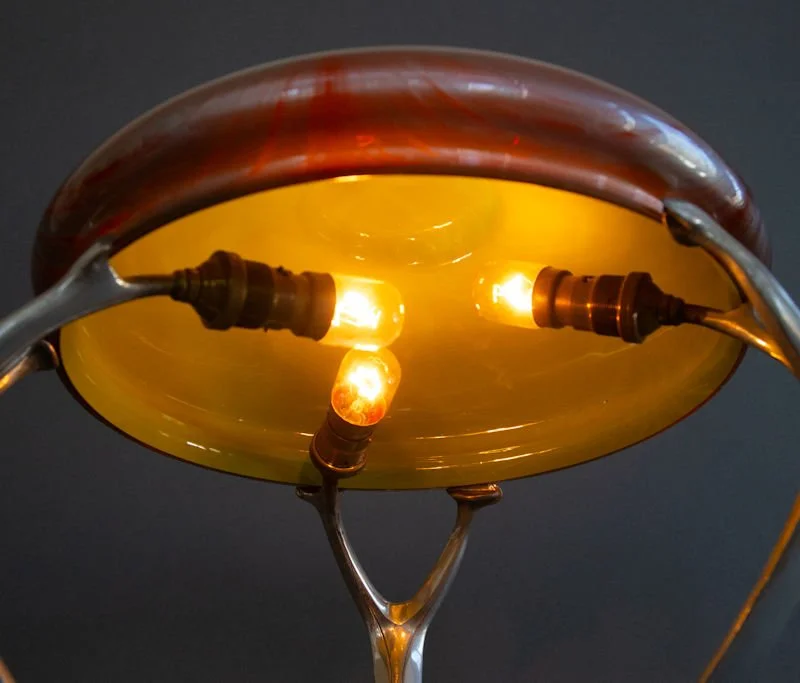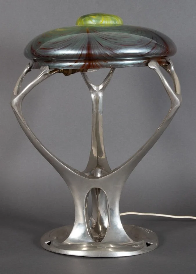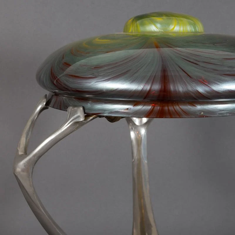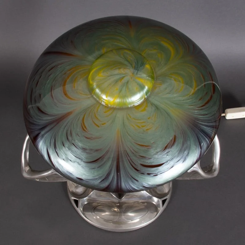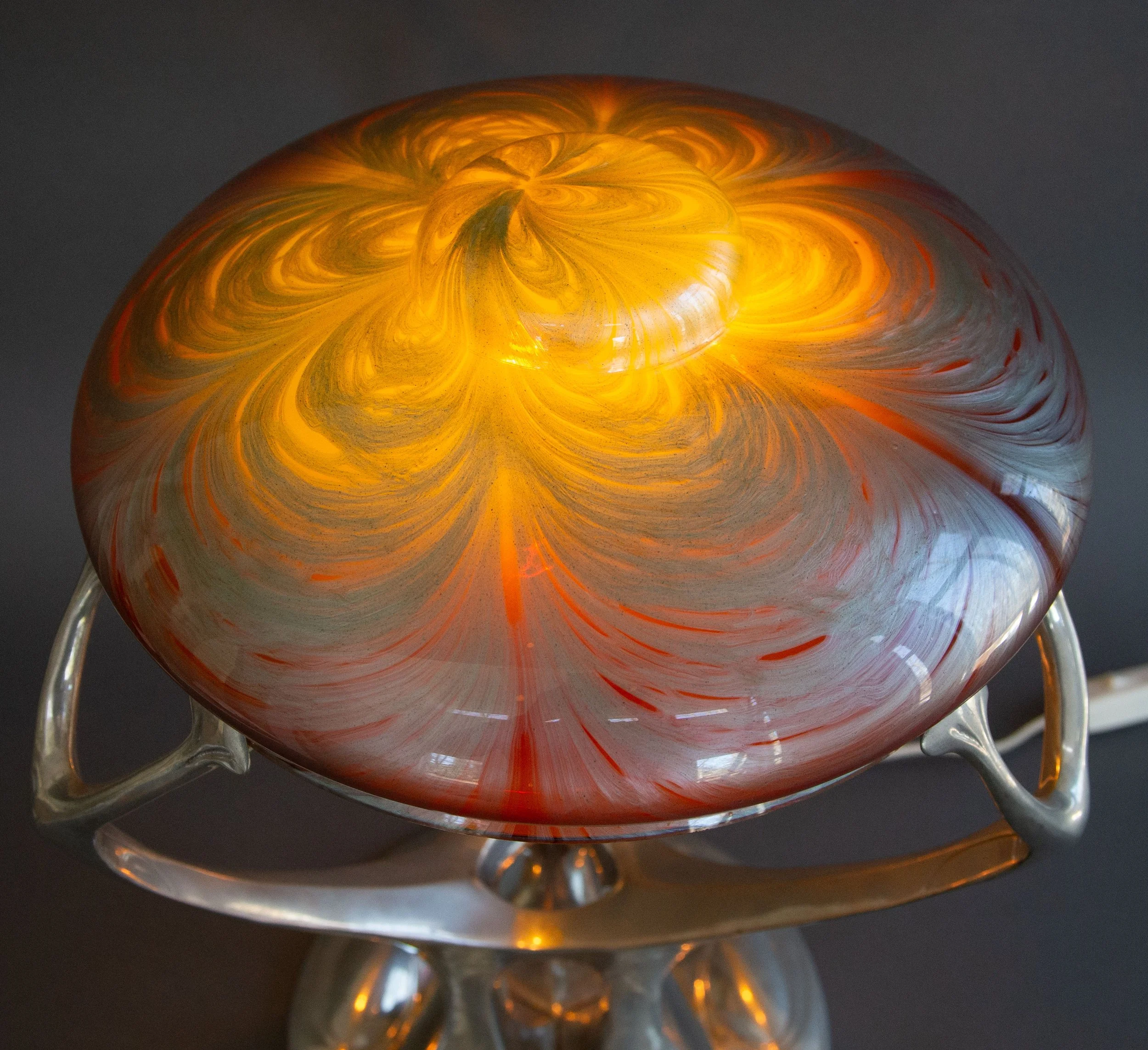 Friedrich Adler, Walter Scherf &Co. / Osiris & Loetz Titania Lamp. Imposing form that presents larger than dimensions imply; Overall height is 19 1/4” while the shade measures just over 12” in diameter. Marked Osiris at underside of pewter base. Reasonably new wiring that is perfectly functional though be informed that the sockets use European bulbs which are readily available (three bulbs included with purchase). Overall condition is excellent having no breaks, no repairs or damage to the metal work. The shade is also undamaged. One minor issue exists, from various vantage points the shade appears slightly out of level which we have attempted to emphasize in our images. No apologies, simply full divulgence ~ always! In this functional artistic object one can envision the culmination of this great designer’s eye and hand, coupled with nature, produced by machine and artist craftspeople, collaborating with Loetz and Walter Scherf, & sprinkle in that new technology ~ electricity! Nature ~ Form ~ Function ~ Friedrich Adler was an astounding architect and designer working in almost every field imaginable. Sadly, executed by the Nazis in 1942. Provenance: Taken from Klingon Battle Cruiser by Captain Kirk!
