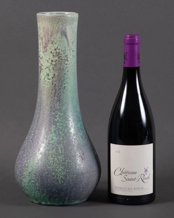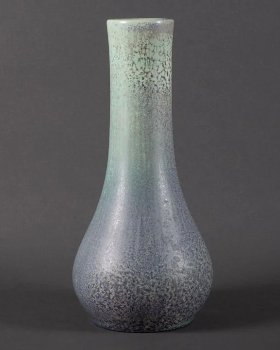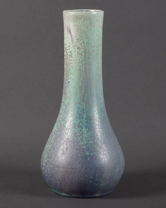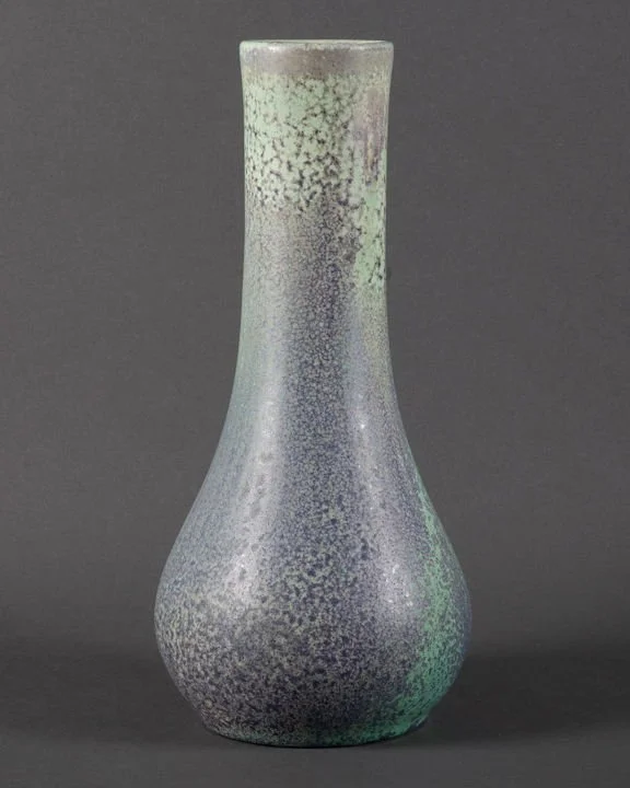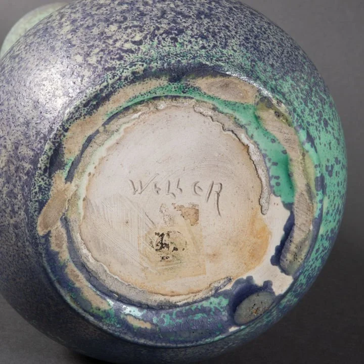 1903-1904, Weller Arts & Crafts Art Pottery Vase with an exceptional crystalline glaze. Rare pot! Excellent condition. The following should be considered a conversation rather than a correlation to the price quoted. I am intrigued by this vase on every level. I cannot find this shape / form on any other Weller vase which is unusual given the fact that the majority of such products were typically slip cast. This outstanding crystalline glaze is equally unusual, not to mention visually stunning. What is the origin of this form and glaze? I found several Clewell vases of similar form, not identical ~ similar. Is there a French connection given Jacque Sicard and Henri Gellee’s presence? Though there is zero evidence that Frederick Hurten Rhead had anything to do with this vase, it is interesting to note that he was employed by Weller during the same period this pot was produced. Further, in 1905-1906 FHR produces crystalline glazes for Roseville. Too coincidental in my mind. Oh how I wish this vase could talk! Rare and beautiful vase. Enjoy as I do.