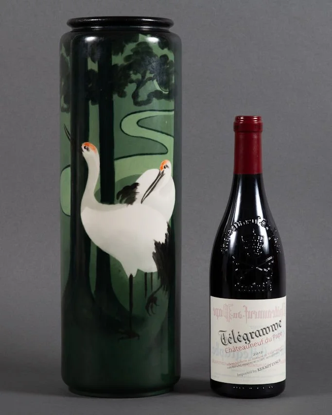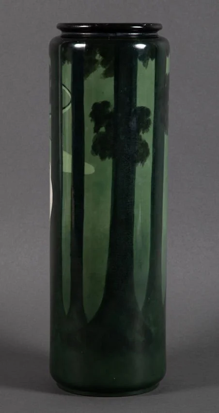 Circa 1905 Willets Belleek American Arts & Crafts Pictorial Vase decorated with a forestscape and storks. Tall ~ measuring 16” tall and 5” in diameter. Excellent and undamaged condition. No chips, no cracks, and no repairs.