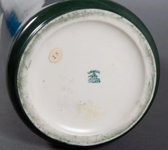 Willets Manufacturing Company of Trenton New Jersey was a prominent and prolific factory producing the “American Belleek” from 1879 to about 1914. The current vase being offered represents their efforts in the Arts & Crafts arena with hand decorated stylized motifs often painted onto Limoges blanks as it is common for find this and similar forms marked Limoges.