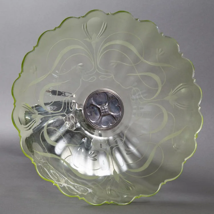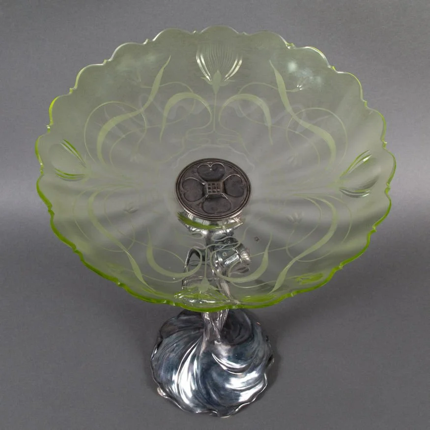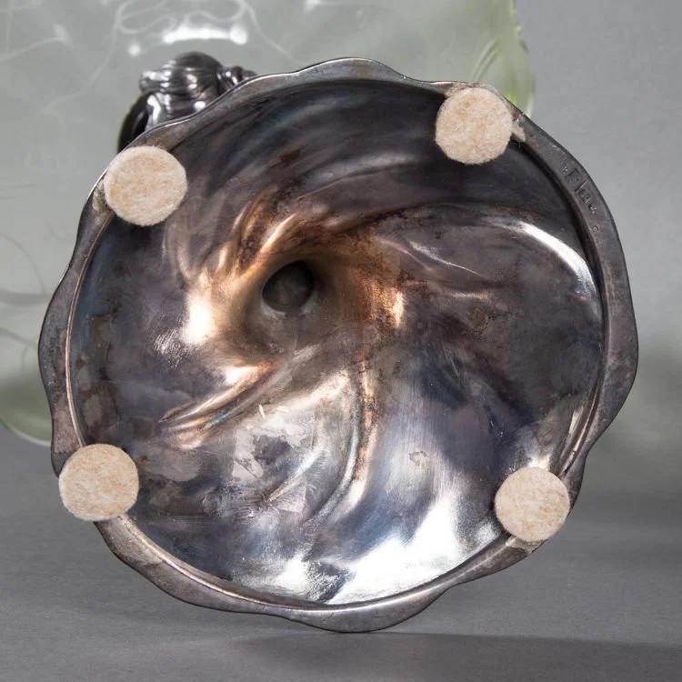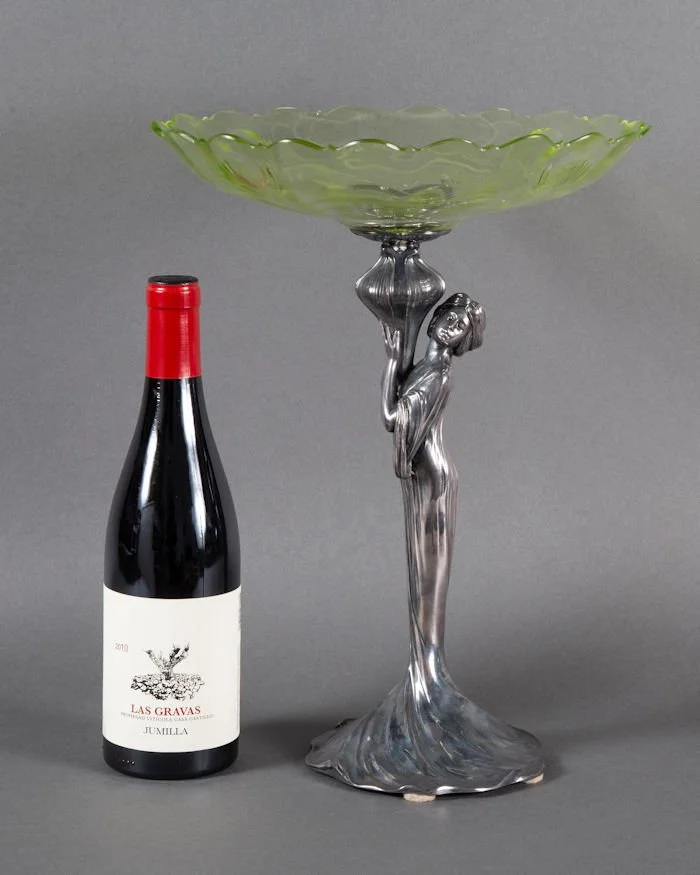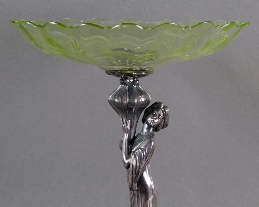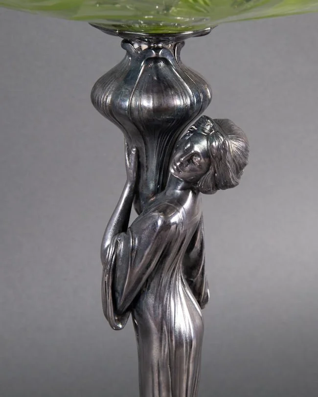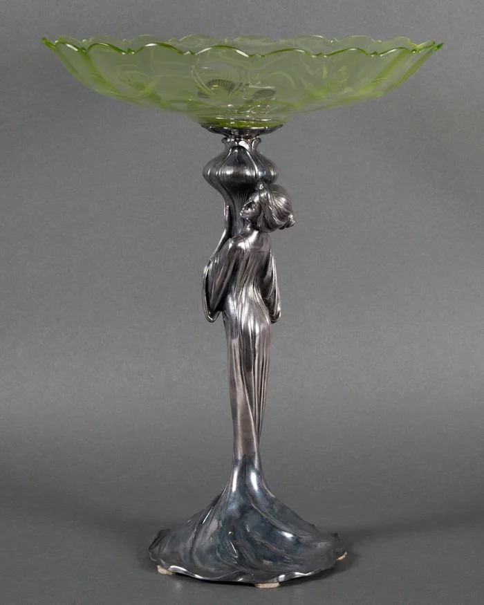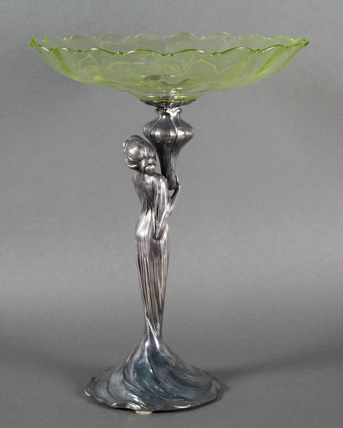 We urge you to pull out a ruler so as to understand the size and scale of this object. Stands just short of 16 inches tall and 12 inches in diameter at the glass bowl. Produced by WMF Circa 1905. Boasts an Art Nouveau Standing Female Figure holding a flower blossom that becomes the cut glass basin. Lemon yellow glass bowl depicting whiplash vegetation and blossoms. Glass maker unknown by us, though it is safe to say Bohemian. Haida? Excellent and undamaged condition.