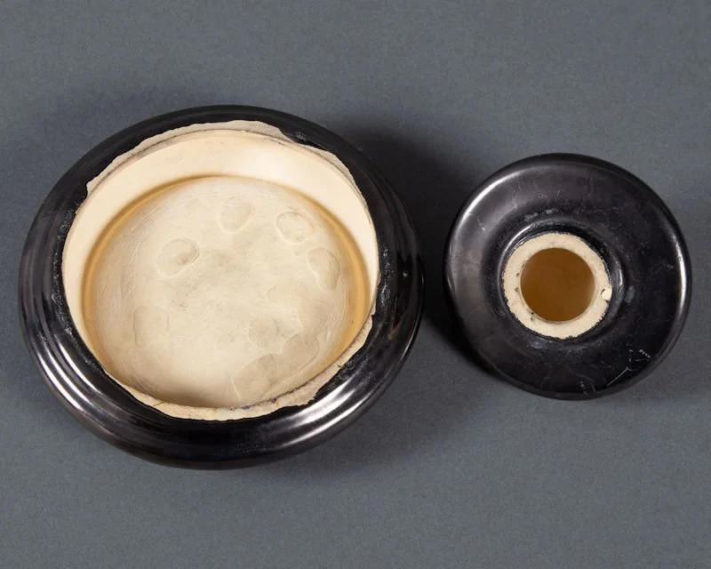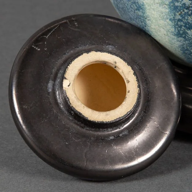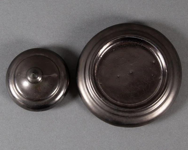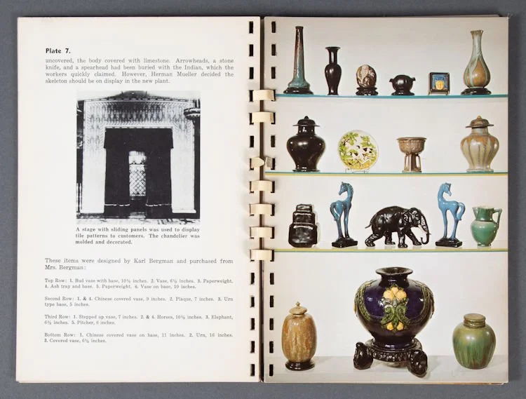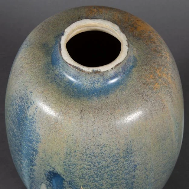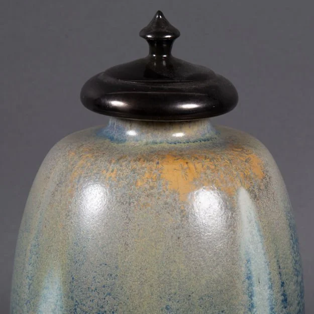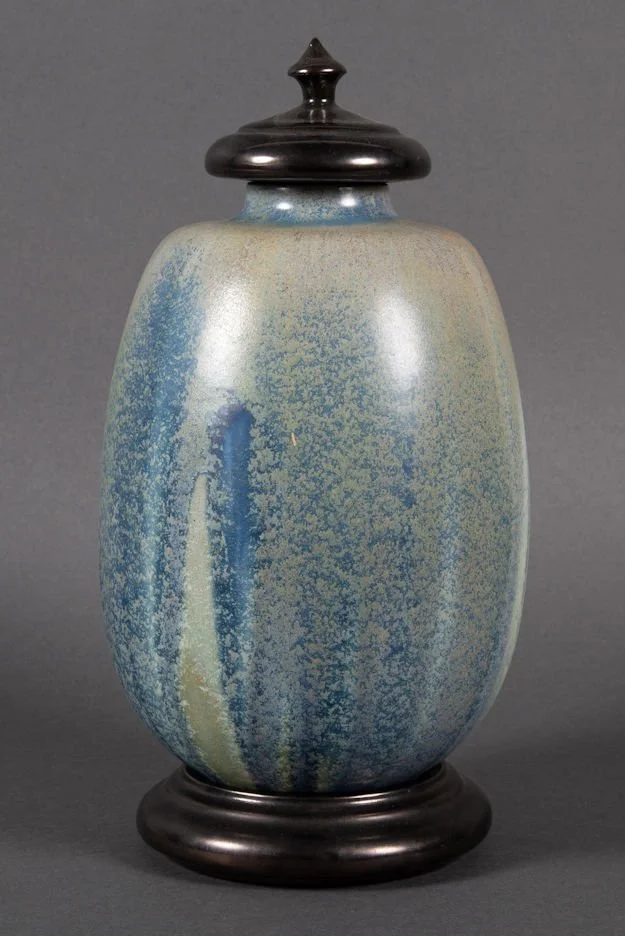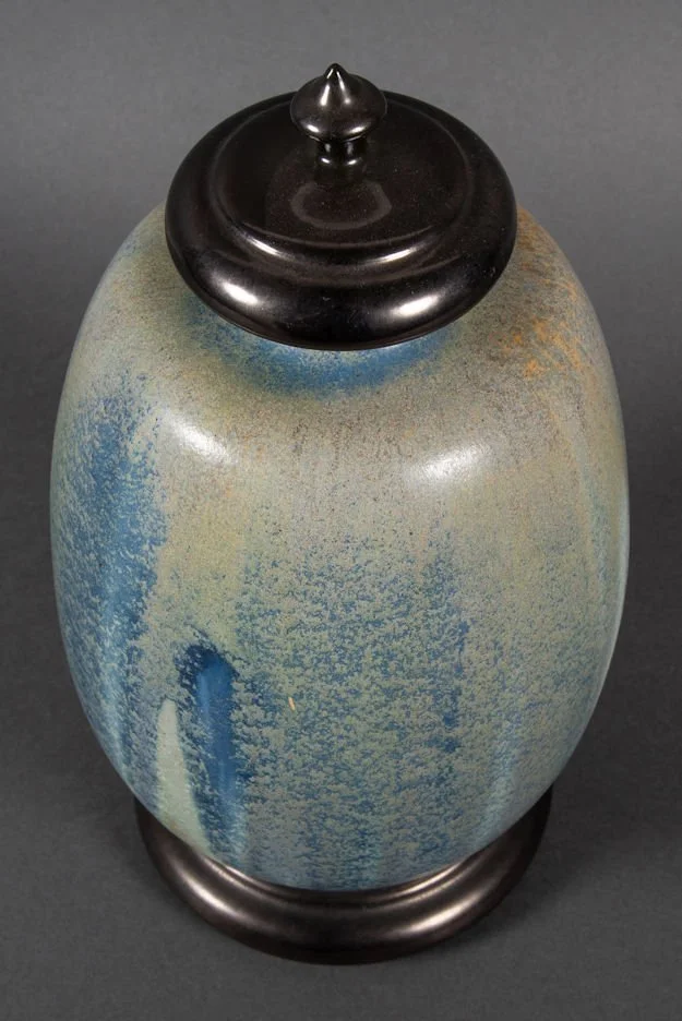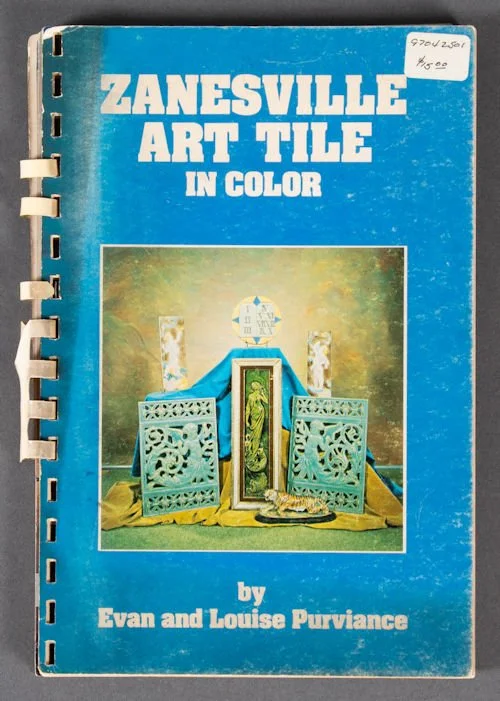 Karl Bergman for American Encaustic Tile Company; Zanesville, Ohio ~ Circa 1900. 11 inches tall. Three-part vessel: Base, vase, and lid. Unmarked. Reference “Zanesville Art Tile in Color” by Evan & Louise Purviance, plate 7. (shown below). Condition: Excellent excepting one very minor chip to underside of lid. $1500